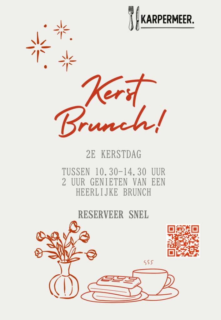 Kom 2de kerstdag gezellig genieten van een heerlijke uitgebreide Brunch bij ons in het Karpermeer, buiten heerlijke hapjes zijn een heerlijk welkomstdrankje, en 2x koffie/thee inbegrepen. De kosten per persoon bedragen € 25,00 per persoon, reserveren doe je via het onderstaande formulier.